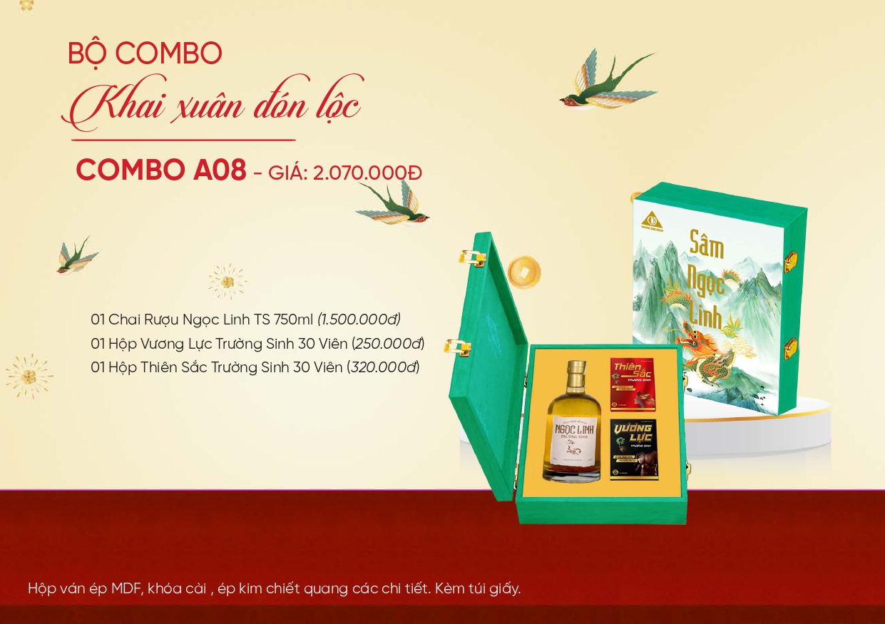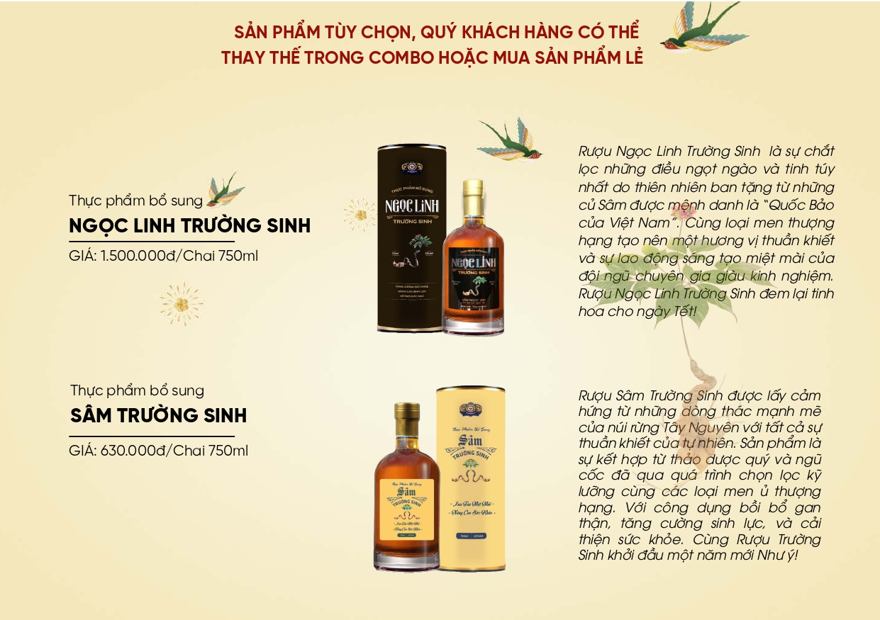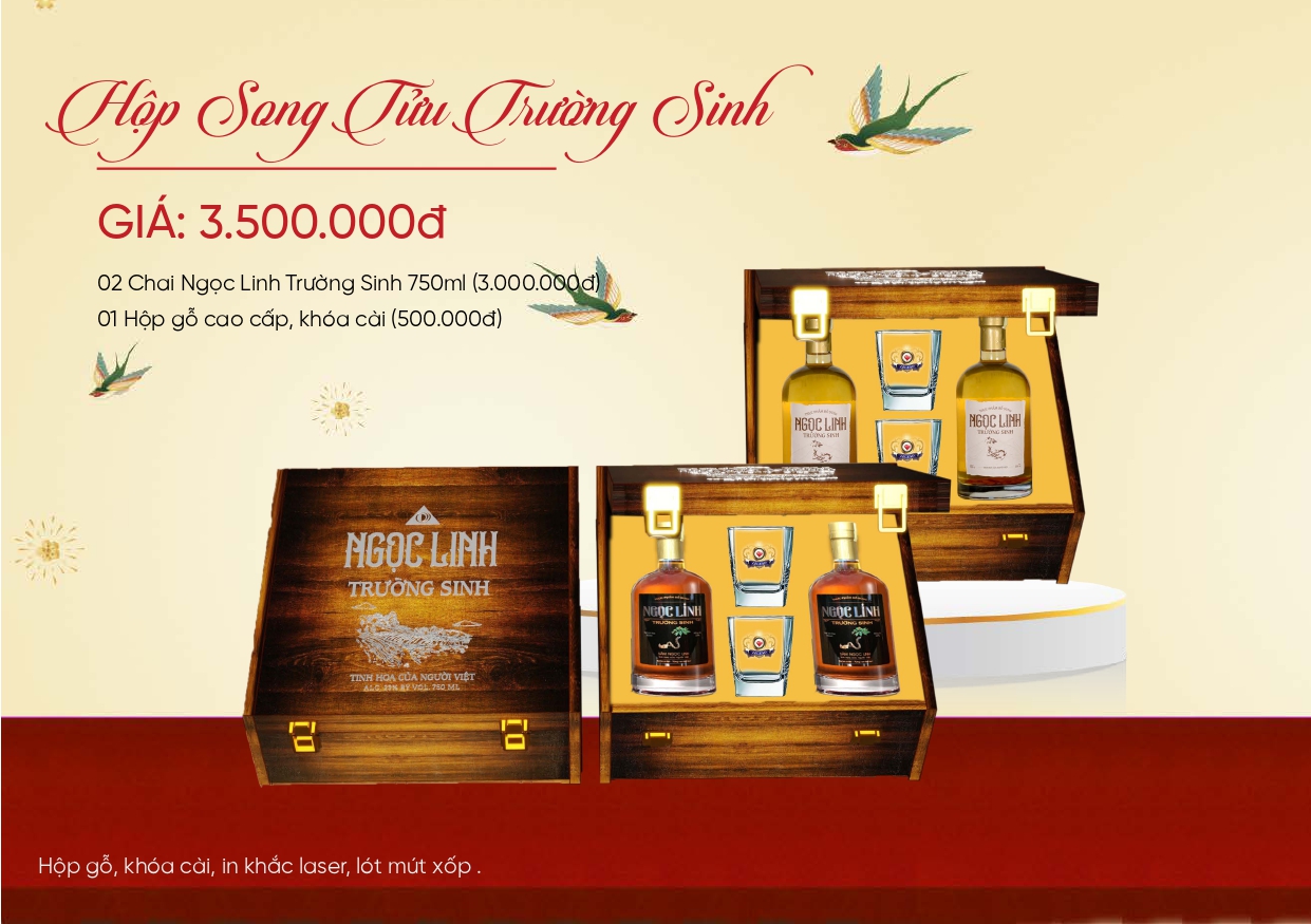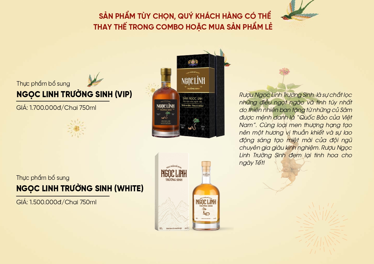 Ngọc Linh Trường Sinh: được lên men từ ngũ cốc thượng hạng kết hợp chiết xuất Sâm Ngọc Linh đem lại tinh hoa cho ngày Tết “Tinh hoa của người Việt”.